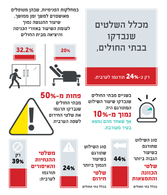 3. תדירות ואיכות פיקוח נמוכות – הפיקוח של משרד הבריאות כולל ביקורת בתדירות נמוכה ובחינת עמידה בשלל יעדים, שהתרגום הוא רק מרכיב קטן בהם. מצב דברים זה אינו מאפשר מתן תשומת לב ראויה לסוגיית השילוט בערבית. .