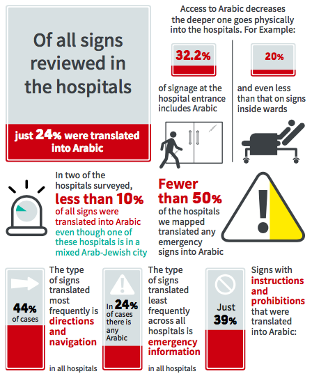 1. Set a uniform policy. It is necessary to formulate a consistent policy for making Arabic signage accessible in hospitals. Every new sign posted in a hospital should appear in Arabic in a location and font size equal to the sign in Hebrew.