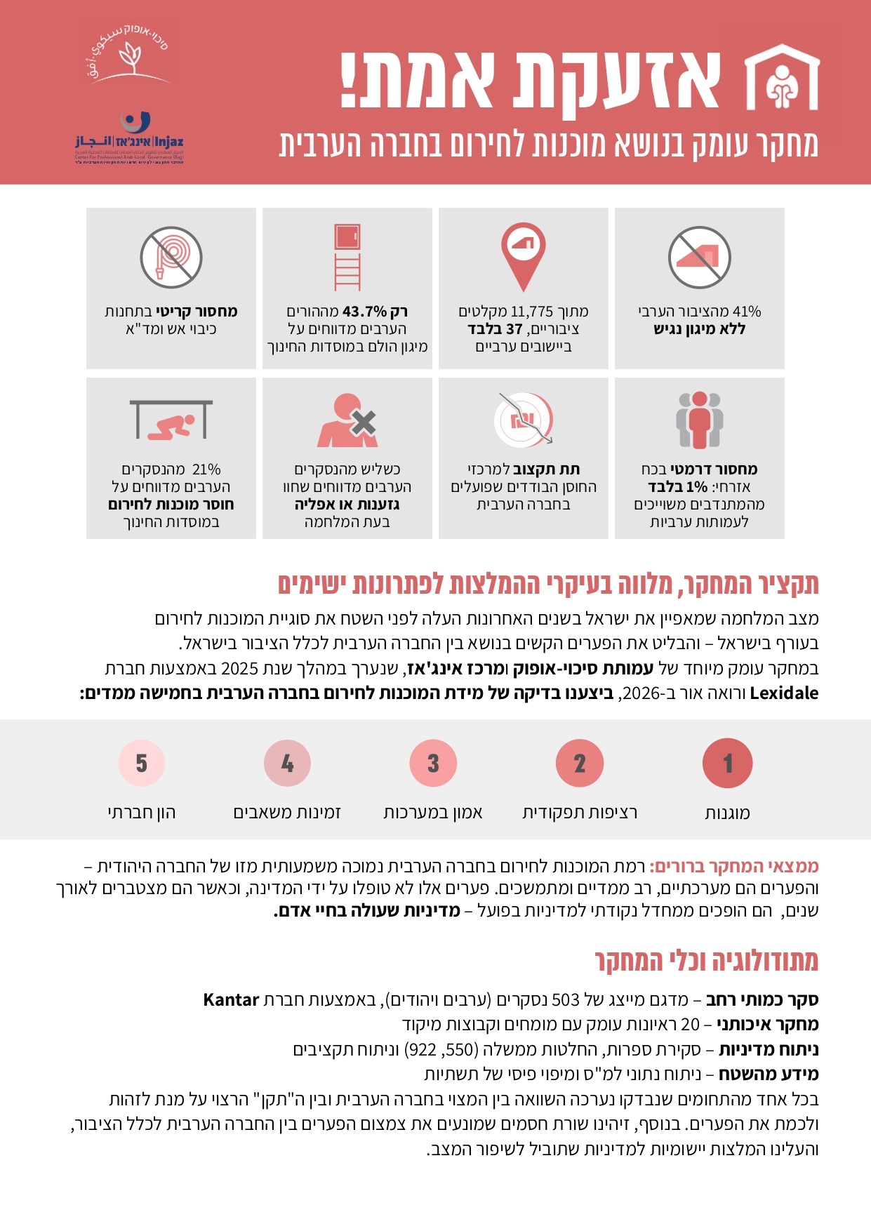 עמוד הבית פרסומים | اصدارات הכלמדד השוויוןמחקרי מדיניותניירות עמדה ופרסומים נוספיםפרסומים הצג לפי תחום הצג לפי תחוםA-Listאי ביטחון תזונתיאלימות ופשיעהדיור ביישובים הערבייםהחלטות חומש ממשלתיות לצמצום פעריםהרחבת גבולות והגדלת הכנסות ברשויות הערביותהתחדשות עירונית בישובים הערבייםחברה משותפתחינוך לחיים משותפיםייצוג בתקשורתייצוג הולםייצוג הולם בתעסוקהמדיניות שיוויוניתמרחב ציבורי משותףפיתוח כלכליפעילות ציבוריתקידום הכנסות עצמיות לרשויות מקומיות ערביותקידום שוויון בנגבתחבורה ציבורית ביישובים הערבייםתכנון מדיניות שוויוניתתכנון מדיניות שוויונית הצג לפי שנה הצג לפי שנה2026202320222021202020192018201720162015201420132012201120102009200820072006200520042003200220012000 פברואר 2026רישוי בנייה ביישובים הערביים: מיפוי פערים, חסמים והמלצות מדיניותקיראו באתרעבריתלהורדה כ-PDFעבריתדצמבר 2023המלצות למניעת הסלמה ושמירה על מרקם החיים המשותפים בין יהודים וערביםקיראו באתרעבריתלהורדה כ-PDFעבריתאפריל 2022קידום חינוך לחיים משותפים בהכשרות סטודנטים להוראהקיראו באתרالعربية | עבריתלהורדה כ-PDFالعربية | עבריתפברואר 2022השפה הערבית בחינוך העברי ככלי לשותפות - נייר עמדהקיראו באתרעבריתלהורדה כ-PDFעבריתפברואר 2022מדיניות כוללת המקדמת חינוך לחיים משותפים - נייר עמדהקיראו באתרעבריתלהורדה כ-PDFעבריתפברואר 2022מקורות ההכנסה של הרשויות המקומיות הערביות מחקר השוואתיקיראו באתרالعربية | עבריתלהורדה כ-PDFالعربية | עבריתנובמבר 2021נוכחות השפה הערבית בשירותי תחבורה ציבוריתקיראו באתרالعربية | עבריתלהורדה כ-PDFالعربية | עבריתינואר 2021התחדשות עירונית ביישובים הערבייםקיראו באתרלהורדה כ-PDFתקציר מנהליםالعربية | עבריתלהורדה כ-PDFالعربية | עבריתיולי 2020הפתרון למחסור בנגישות לגני ילדים בישובים הערבים הבדואים בנגב - ניר עמדהקיראו באתרעבריתלהורדה כ-PDFעבריתיולי 2020התמודדות משרד החינוך עם יחסי ערבים יהודים כנושא שנוי במחלוקתקיראו באתרלהורדה כ-PDFיולי 2020התייחסות עמותת סיכוי לקראת גיבוש תוכנית ממשלתית להתמודדות המשק עם נזקי הקורונהקיראו באתרעבריתלהורדה כ-PDFעבריתאפריל 2020דרישה משותפת לייצוגה של החברה הערבית במוקד קבלת ההחלטותקיראו באתרעבריתלהורדה כ-PDFעבריתאפריל 2020פנייה לערוץ 13 במחאה על הורדת מהדורת החדשות בערבית "אל אוסבוע" ו"אל אוסבוע פי רשת"קיראו באתרעבריתלהורדה כ-PDFעבריתמרץ 2020דרישה להוספה מיידית של מתחמי "דרייב אין" ביישובים ערבייםקיראו באתרעבריתלהורדה כ-PDFעבריתדצמבר 2019הנכחת החברה הערבית בחומרי לימודקיראו באתרעבריתלהורדה כ-PDFעבריתנובמבר 2019פנייה לנציב שירות המדינה: קביעת יעד חדש לייצוגם ההולם של האזרחים הערבים בשירות המדינהקיראו באתרעבריתלהורדה כ-PDFעבריתנובמבר 2019דו"ח שלד לרשויות המקומיות הערביות בנושא הרחבת גבולות שיפוטקיראו באתרالعربية | עבריתלהורדה כ-PDFالعربية | עבריתתקציר מנהליםالعربية | עבריתלהורדה כ-PDFالعربية | עבריתנובמבר 2019דו"ח שלד לרשויות המקומיות הערביות בנושא חלוקת הכנסותקיראו באתרالعربية | עבריתלהורדה כ-PDFالعربية | עבריתתקציר מנהליםالعربية | עבריתלהורדה כ-PDFالعربية | עבריתיולי 2019בינוי מעונות יום ביישובים הערבים - חסמים והמלצות מדיניותקיראו באתרלהורדה כ-PDFדצמבר 2018הפתרון למחסור בנגישות לגני ילדים בישובים הערבים הבדואים בנגב ניר עמדה – דצמבר 2018קיראו באתרעבריתלהורדה כ-PDFעבריתיוני 2018התאמת תכנית "מחיר למשתכן" לישובים הערבייםקיראו באתרלהורדה כ-PDFתקציר מנהליםעבריתלהורדה כ-PDFעבריתאפריל 2018נייר עמדה - החסמים בפני נגישות לתחבורה ציבורית בישובים המנותקים בנגבקיראו באתרעבריתלהורדה כ-PDFעבריתדצמבר 2017מיפוי נוכחות השפה הערבית במקומות בילוי ופנאי למשפחותקיראו באתרלהורדה כ-PDFאפריל 2017עושים שינוי - שנה למדד הייצוגקיראו באתרالعربية | עבריתלהורדה כ-PDFالعربية | עבריתנובמבר 2016חוות דעת כלכלית - ניתוח הכדאיות של קידום ייצוג הולם של עובדי